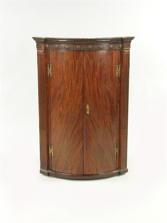 A George III mahogany bowfront hanging corner cupboard, the interior with four oak shelves and three spice drawers, 46.25in (117.4cm) h, 32.5in (82.5cm) w, 22.5in (57cm) d.