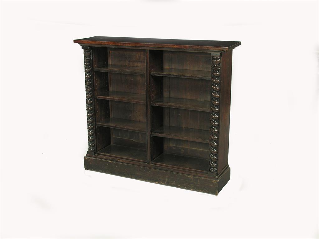 A Victorian simulated rosewood open bookcase, with adjustable shelves and split barley twist pilasters, 42.25in (107.2cm) h, 49in (124.4cm) w, 13in (33cm) d.