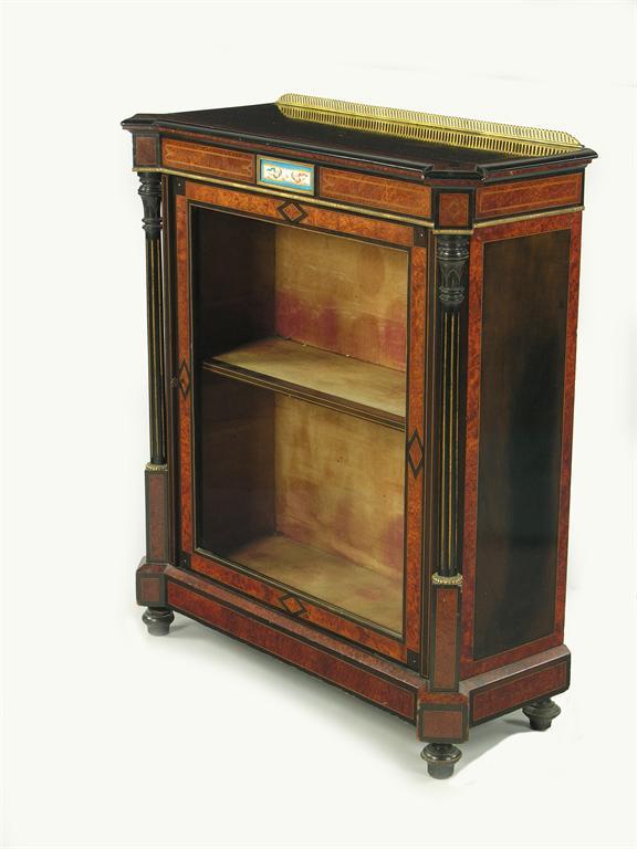 A 19th century French ebonised, thuya and gilt brass mounted side cabinet, the frieze inset a porcelain plaque, the glazed door enclosing a fixed shelf, 44.25in (112.4cm) h, 40in (101.5cm) w, 15.5in (39.4cm) d.