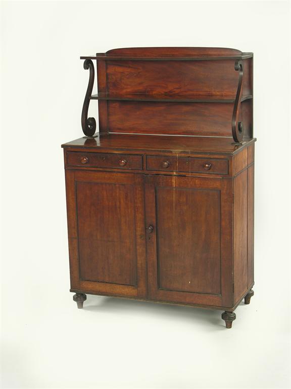 A George IV mahogany chiffonier, the reeded edge tiered back on 'S' scroll supports to a pair of frieze drawers, the panel doors enclosing adjustable shelves, 54.5in (138.5cm) h, 36.5in (92.6cm) w, 18in (45.6cm) d.