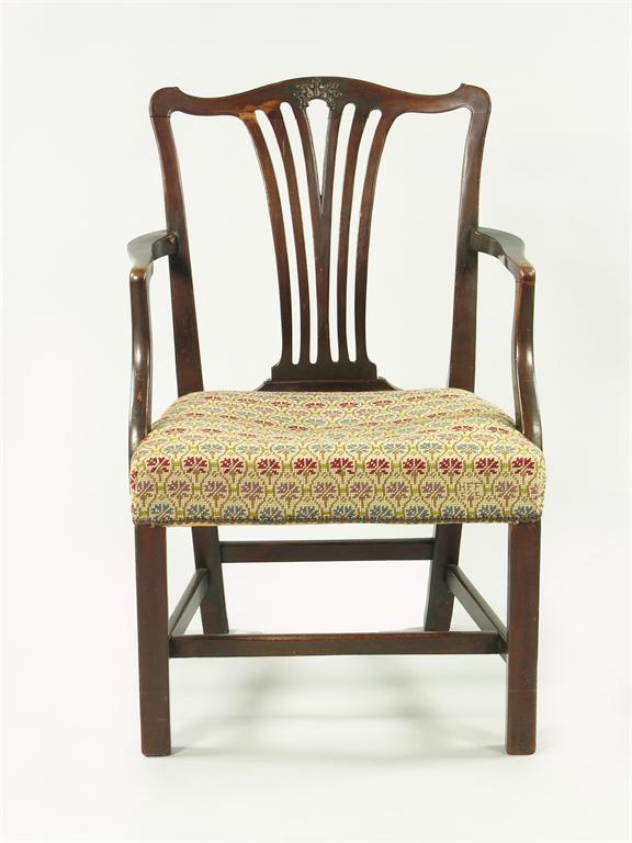A George III mahogany open armchair, with later suffed over seat. Repairs to arms and splat.