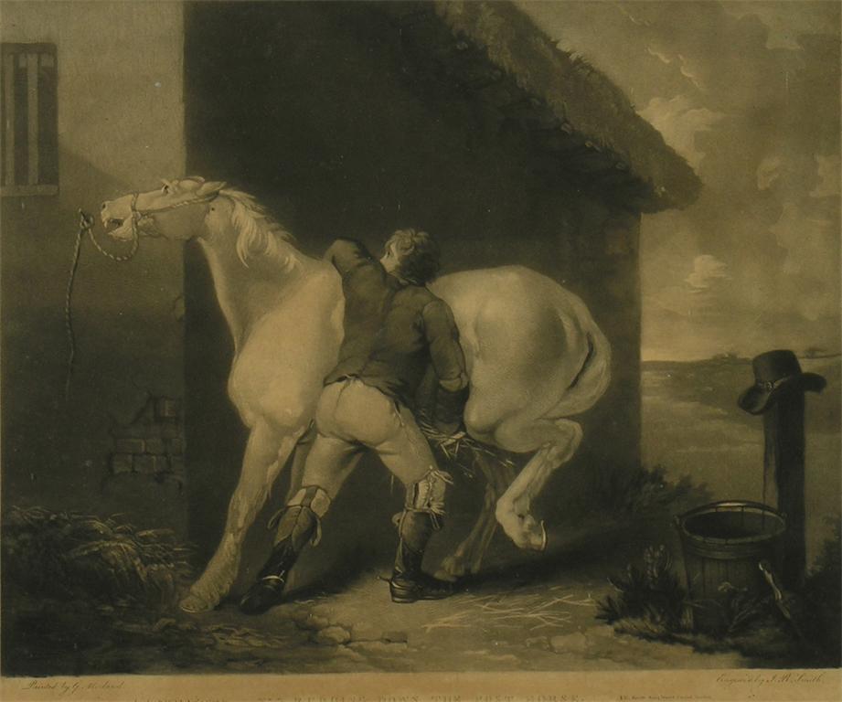 After George Morland. No,3 Watering The Cart Horse, and No,3 Rubbing Down The Post Horse, mezzotints, 13 x 15in (33 x 38cm). (2)