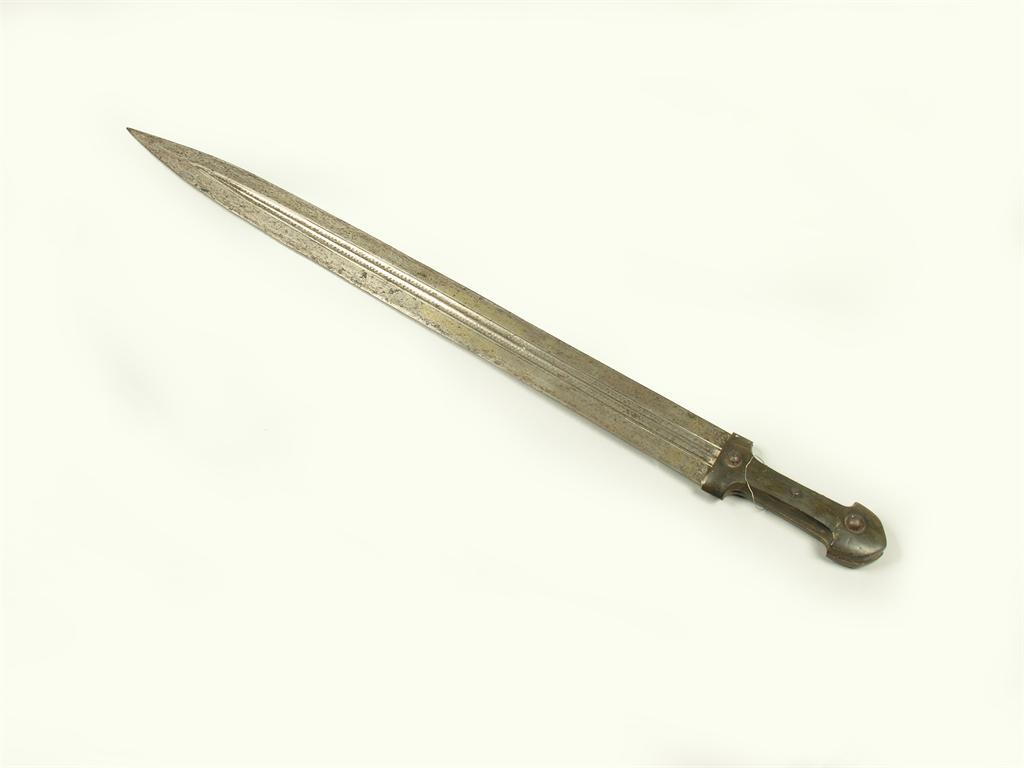 A Persian horn handled short sword, the foliage twin grooved blade inlaid gilt script, 30.25in (77cm) l.