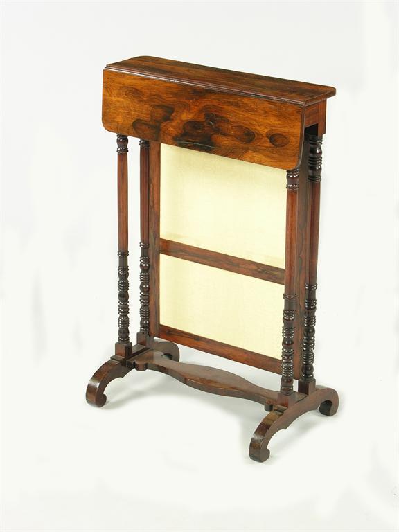 A Victorian rosewood fire screen, the rising back with a hinged flap, on twin turned supports, 28.5in (72.4cm) h, 19.25in (49cm) w, 12in (30.4cm) d.