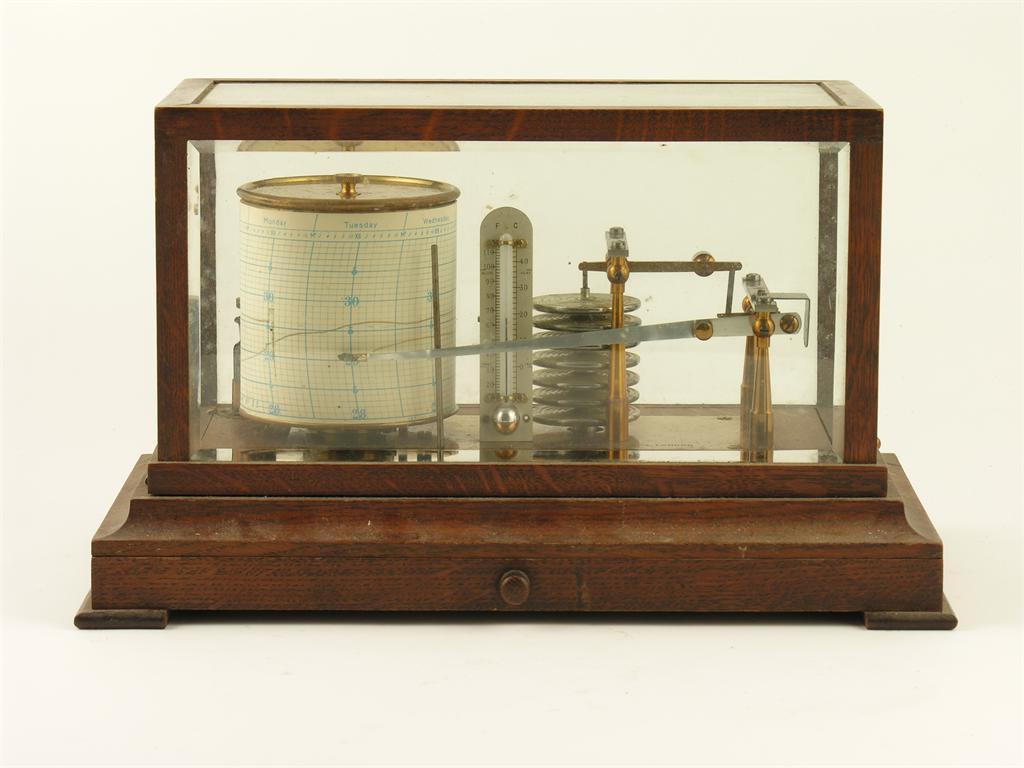 Negretti & Zambra. An oak cased barograph, the seven tiered vacuum to lacquered brass supports, ink pot and thermometer, the bevelled glazed hinged cover to a chart drawer, 8.5in (21.5cm) h, 14.25in (36cm) w, 8.75in (22.2cm) d.