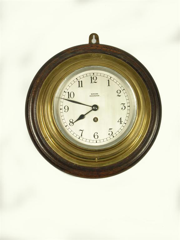 A brass cased bulkhead clock, the silvered 6.5in (16.5cm) dia. dial inscribed 'BARKERS, KENSINGTON,' on a turned oak mount.