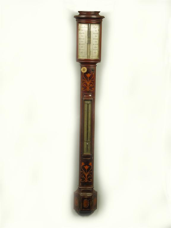 Negretti & Zambra. A late Victorian mahogany and marquetry inlaid bowfront stick barometer