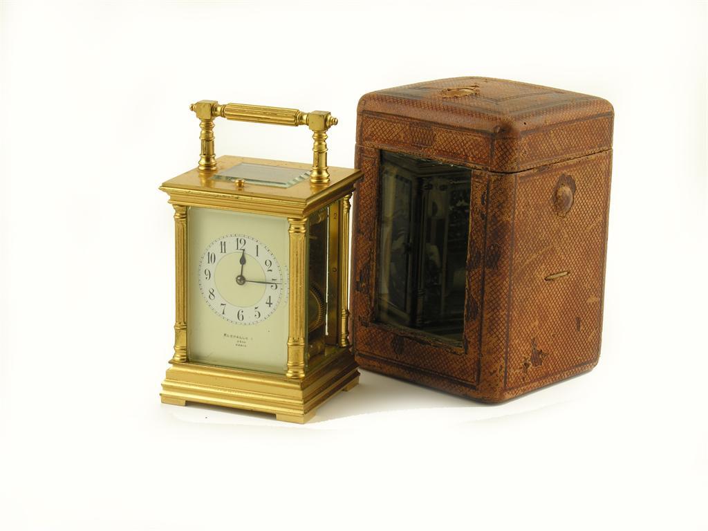 A French brass cased repeating carriage clock, the replaced platform lever escapement striking on a gong, stamped 'E.M&Co' (Maurice & Co) to a painted enamel dial, inscribed 'RUSSELL LTD, 3459, PARIS,' 6.25in (16cm) h, in original travelling case, with key.