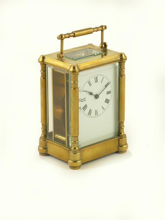 A late 19th century brass carriage clock, the replaced platform lever escapement to an enamel dial, 6.5in (16.5cm) h. Winding key.
