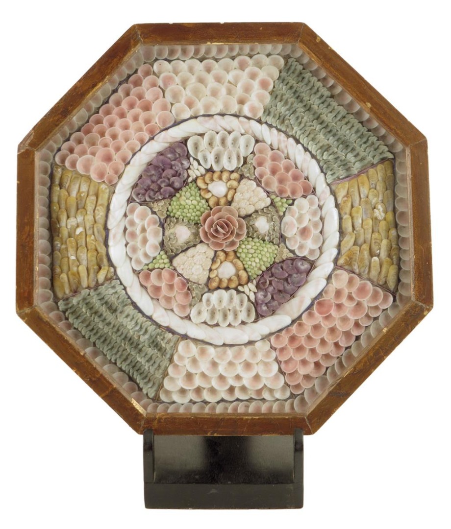A 19th century shellwork sailor's valentine, with an octagonal glazed frame with panels of various shells. 38.3cm wide, with an associated stand. (2)