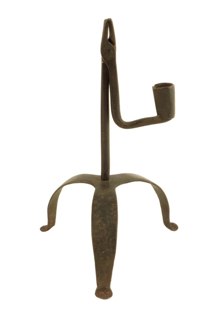 An 18th century wrought iron table rushnip and candle holder, on a tripod base, 25.3cm high.