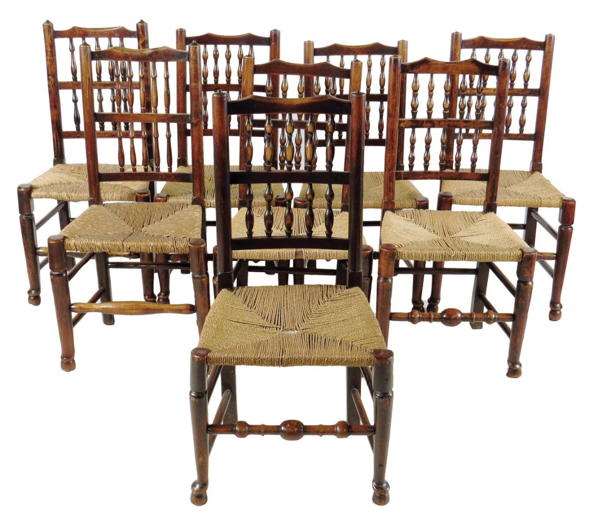 A 19th century harlequin set of eight ash and beech spindle back dining chairs. (8)