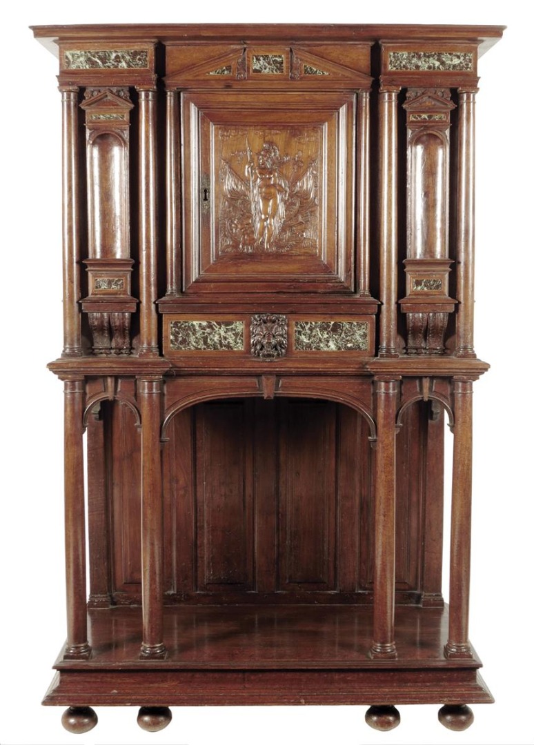 A walnut Renaissance revival cabinet, with marble panels and a classical temple front, with carved columns and niches flanking a central cupboard door carved with Minerva above a drawer with a lion's masks handle and an open base, French or Italian, c.1880, 163.3cm high, 105.6cm wide, 47.7cm deep.