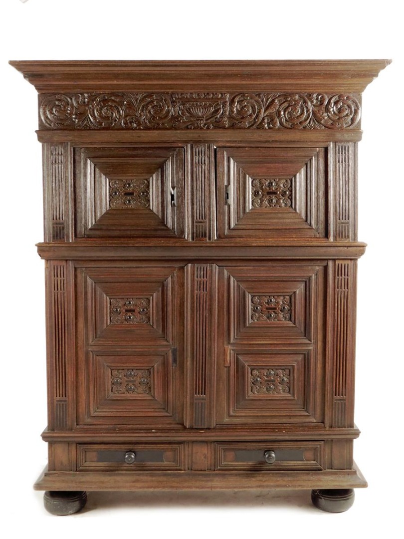 A Flemish oak cupboard, with a detachable moulded cornice above a frieze carved with scrolling foliage with birds and centred an urn above a pair of doors which strap work panels and ebonized decoration, the base with further conforming doors enclosing a shelf above two drawers, all flanked by stop fluted pilasters, on ebonized bun front feet, 17th century and later, 179cm high, 144cm wide, 59cm deep.