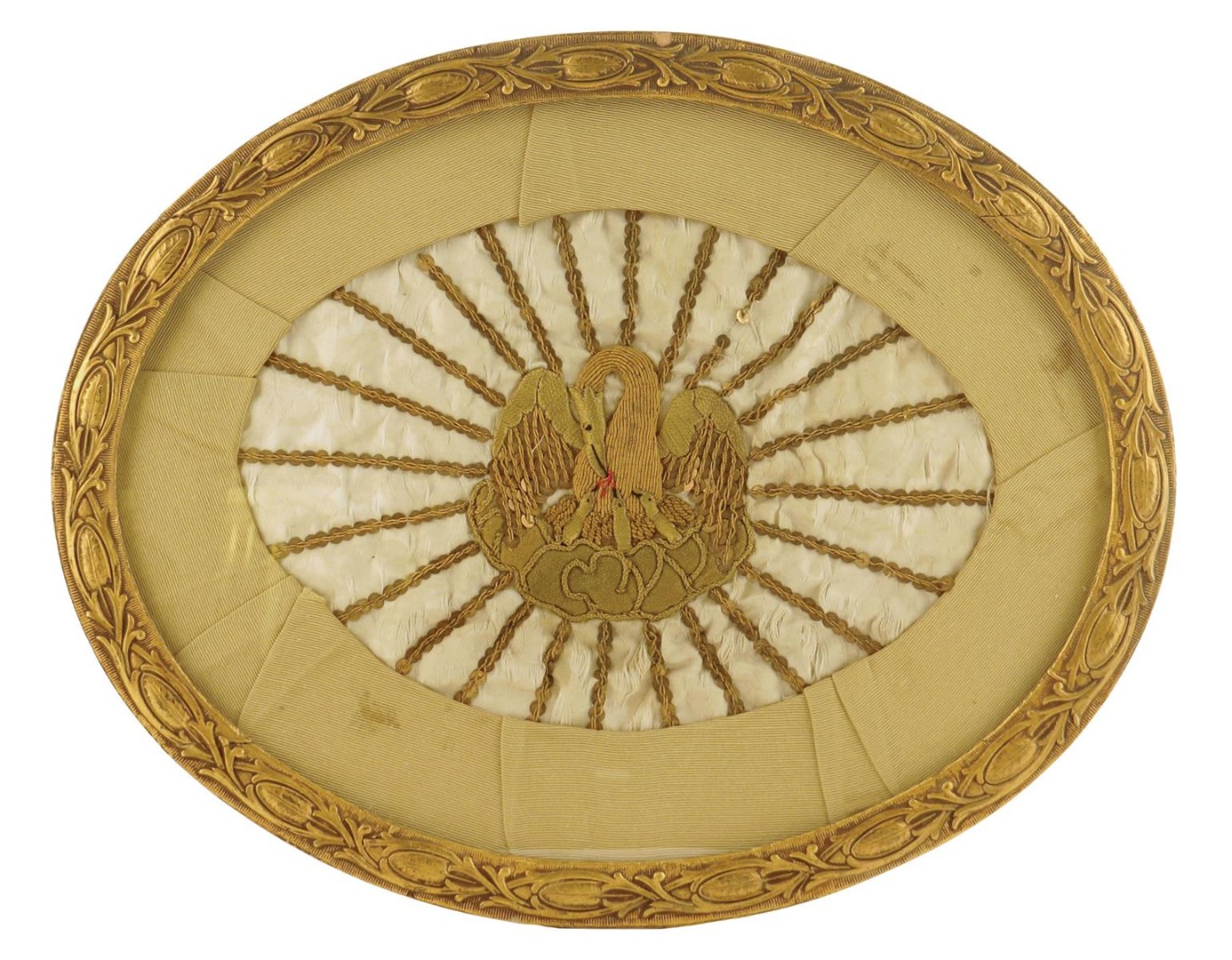 A pair of continental metal thread and gilt metal pictures, depicting the lamb of god sleeping and a swan feeding her offspring, each raised on a silk ground and in a later glazed moulded gilt frame, late 18th / early 19th century, 44 x 35.5cm. (2)