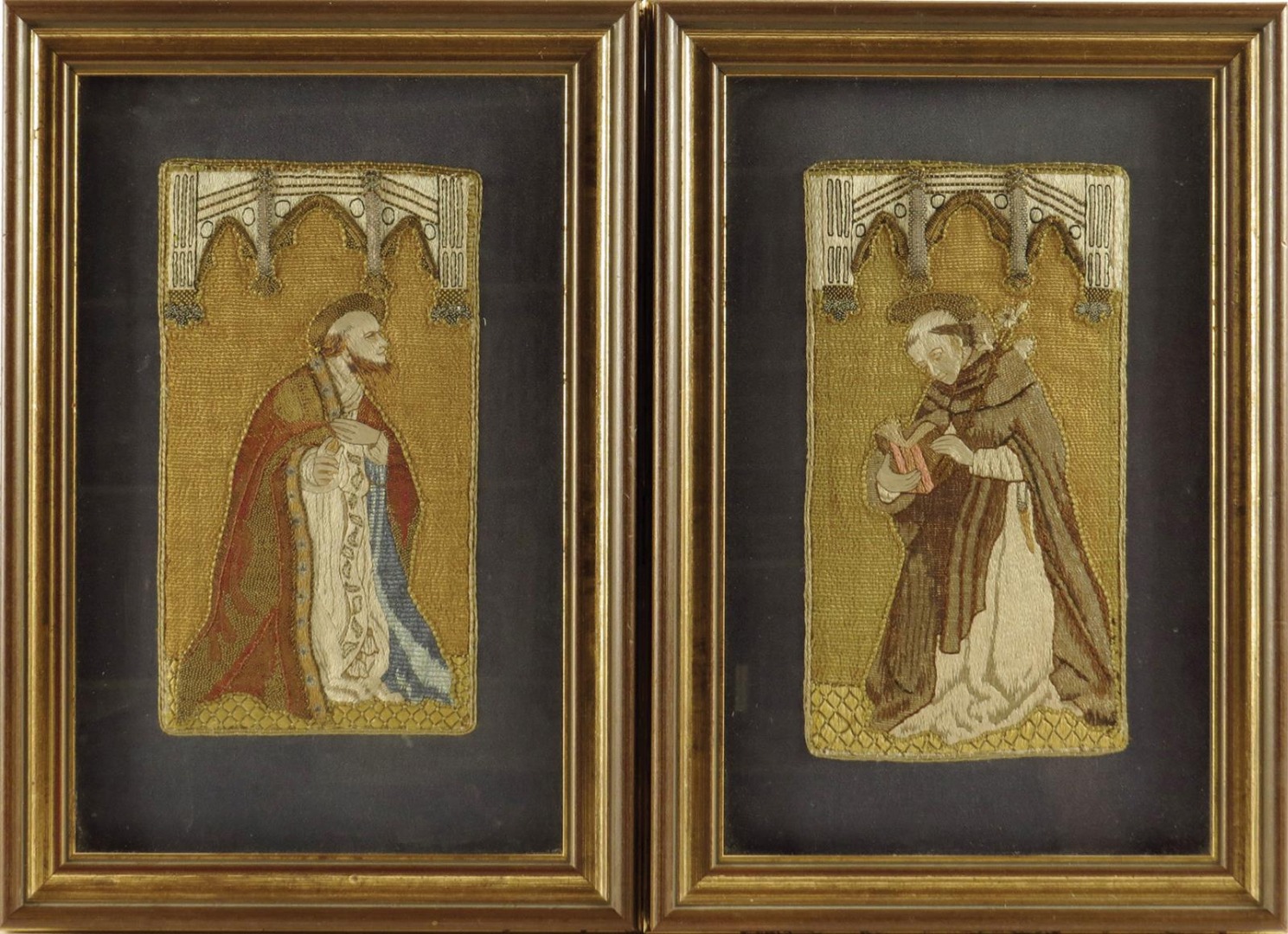 A pair of Italian silkwork and metal thread panels of Saints, one of Saint Anthony of Padua, 18th / 19th century, 22.5 x 12.6cm, each mounted in later glazed gilt frames, the backs with printed labels for 'J. MANLEY, 27, HIGH STREET, ETON'. (2)