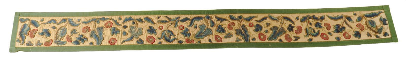 An Italian crewelwork table runner, decorated with flowers and leaves, 323.3 x 36cm.