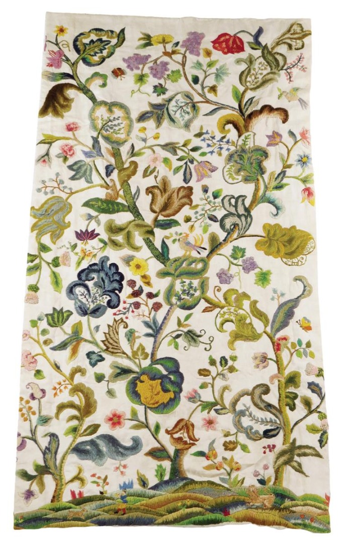 A pair of crewelwork hangings, embroidered with Tree of Life designs, with flowers, figures, a lion, a dog, a kingfisher, various birds, a monkey and a squirrel, early 20th century, 181 x 95cm. (2)