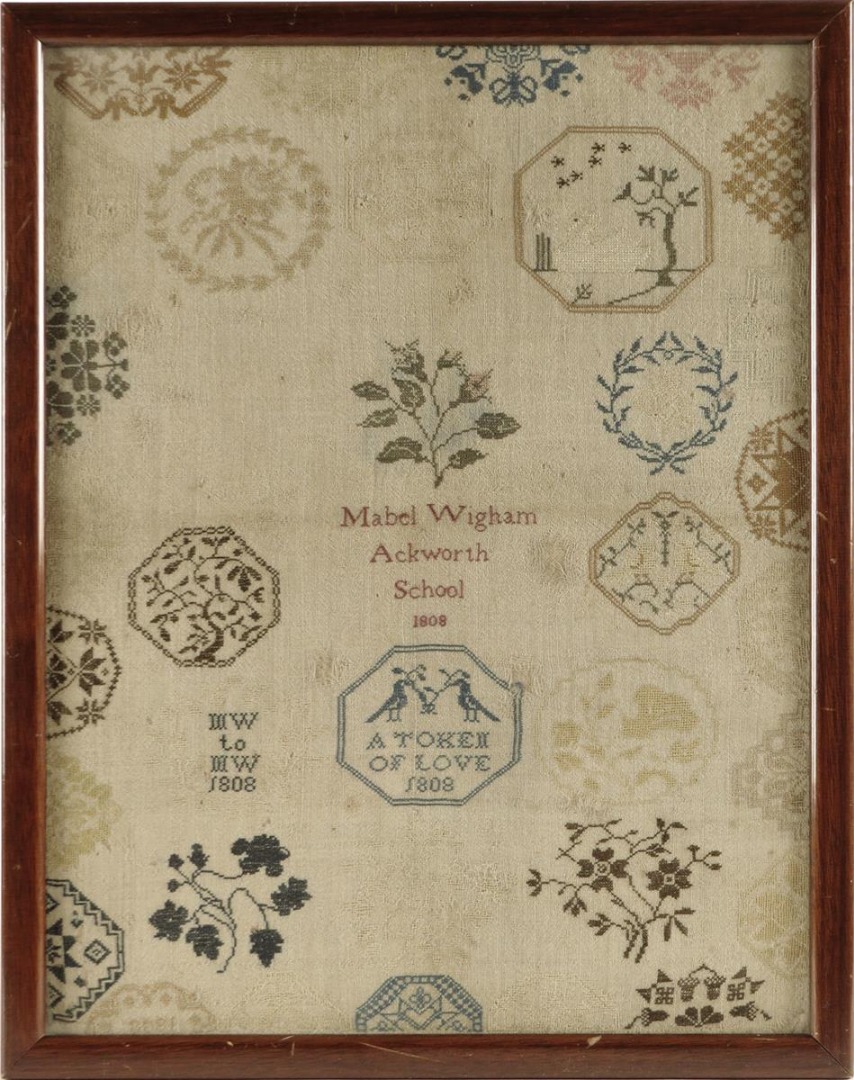 A George III Ackworth School medallion sampler, worked in cross stitch by Mabel Wigham, with flowers, trees, a swan and birds, inscribed ' Mabel Wigham, Ackworth School, 1808', 'A TOKEN OF LOVE 1808' and 'MW to MW 1808', 41.5 x 31.7cm, in a later glazed frame.