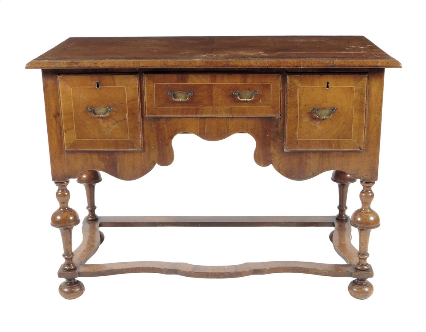 A walnut lowboy in Queen Anne style, the crossbanded and quarter veneered top above three drawers and a wavy edge apron, on inverted baluster supports united by a peripheral stretcher, on bun feet, 77cm high, 106.7cm high, 54.6cm deep.