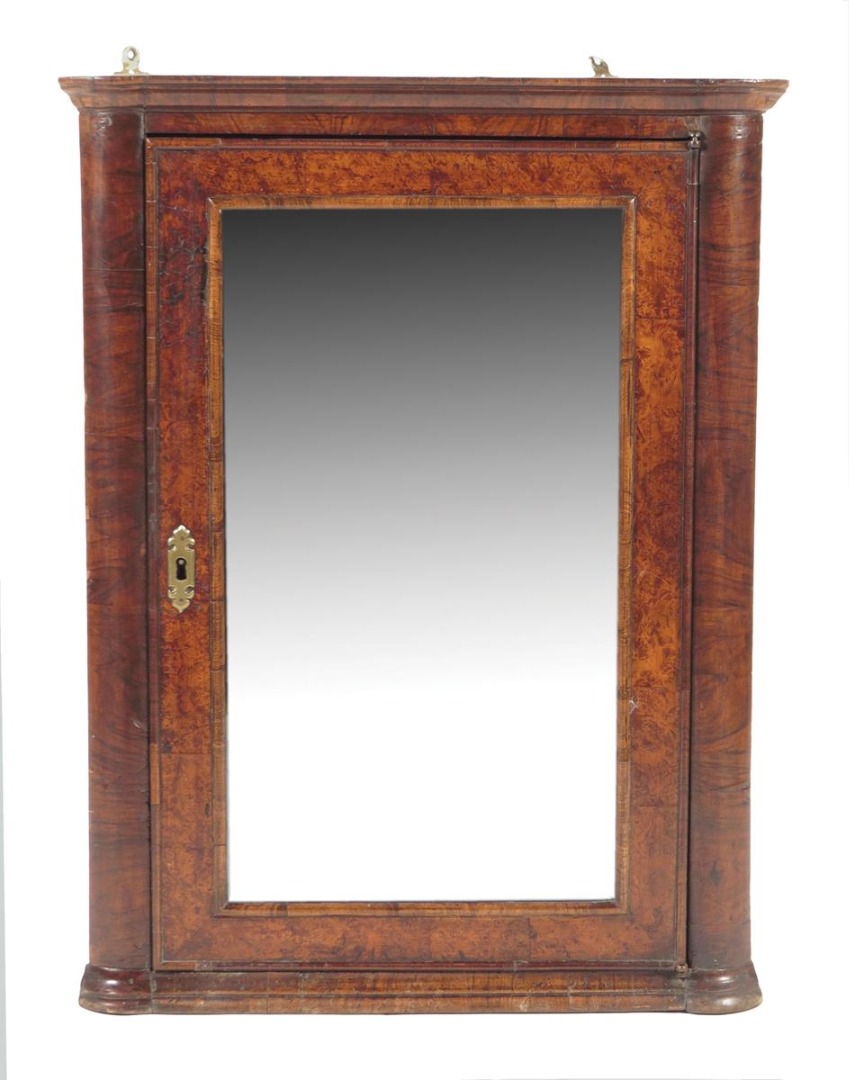 A George II walnut and burr walnut hanging corner cupboard, the door with a bevelled mirror revealing three shelves, 81cm high, 61.7cm wide, 31cm deep.