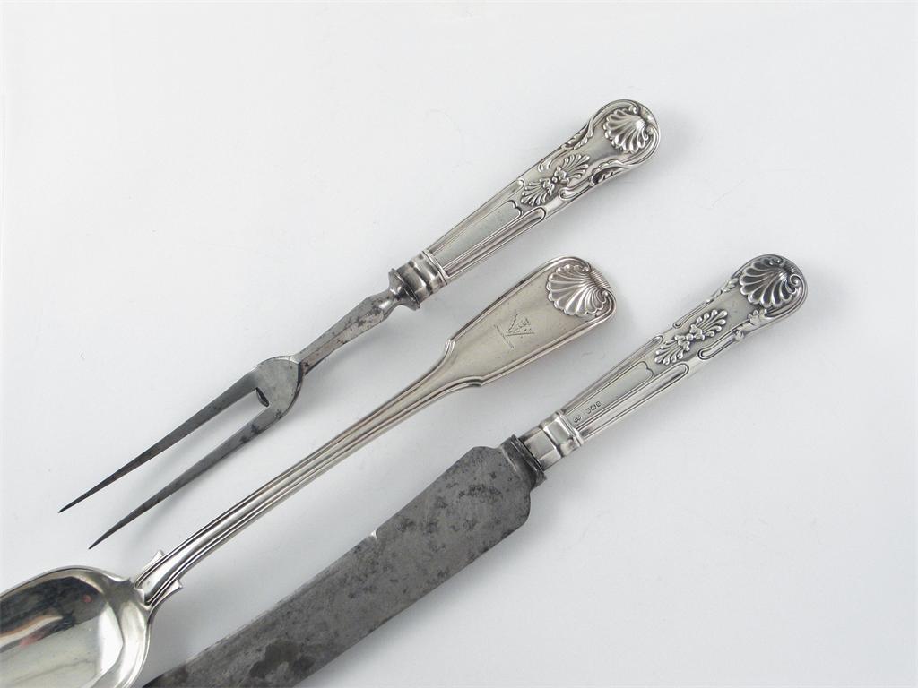 A Victorian basting spoon, fiddle thread and shell pattern, crested, by S. Hayne & D. Cater, London 1860 together with a steel carving fork and knife with Kings pattern handles (the fork handle plated), 6oz weighable silver. (3)