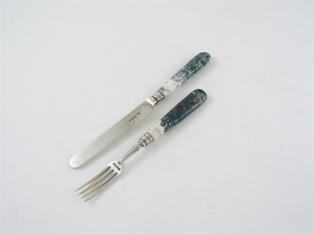 A set of six Victorian dessert knives and six forks, with mossy green and white hardstone handles, by H. Hewson, Sheffield 1857/58. (12)