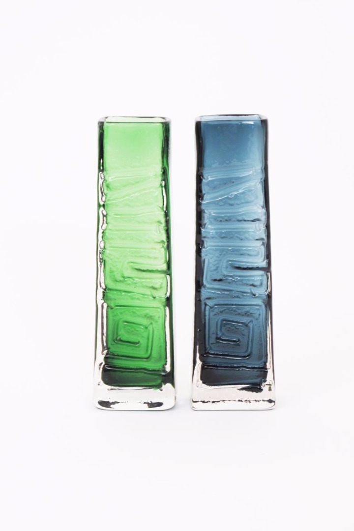 A Whitefriars Meadow Green glass Totem vase designed by Geoffrey Baxter, and a Whitefriars Indigo glass Totem vase, 26.5cm. high (2)