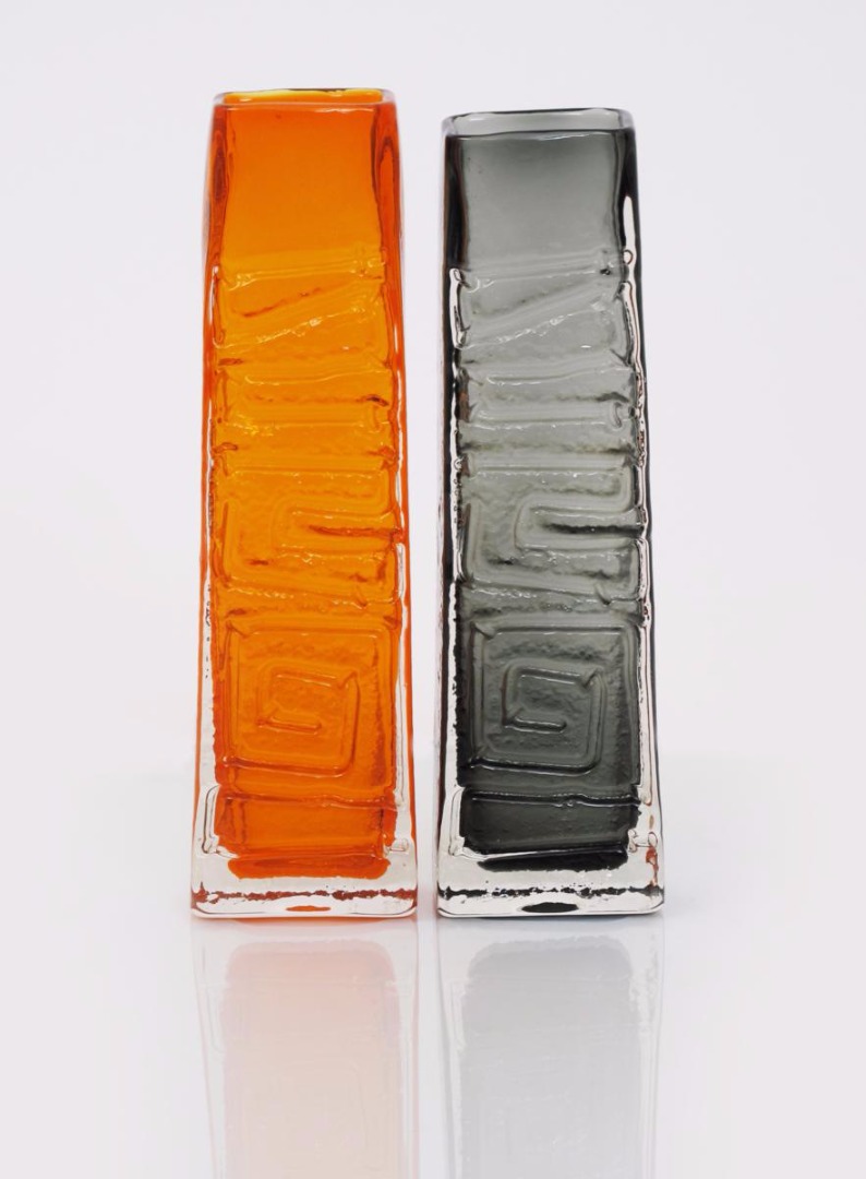 A Whitefriars Tangerine glass Totem vase designed by Geoffrey Baxter, and a Whitefriars Willow glass Totem vase, 26.5cm. high (2)
