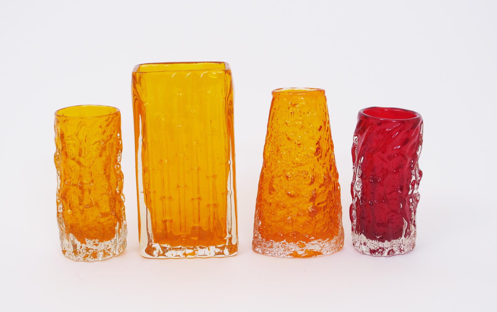 A Whitefriars Tangerine glass Bamboo vase designed by Geoffrey Baxter, two other Whitefriars Tangerine glass vases and a Whitefriars Ruby glass Bark vase 20cm. high (4)