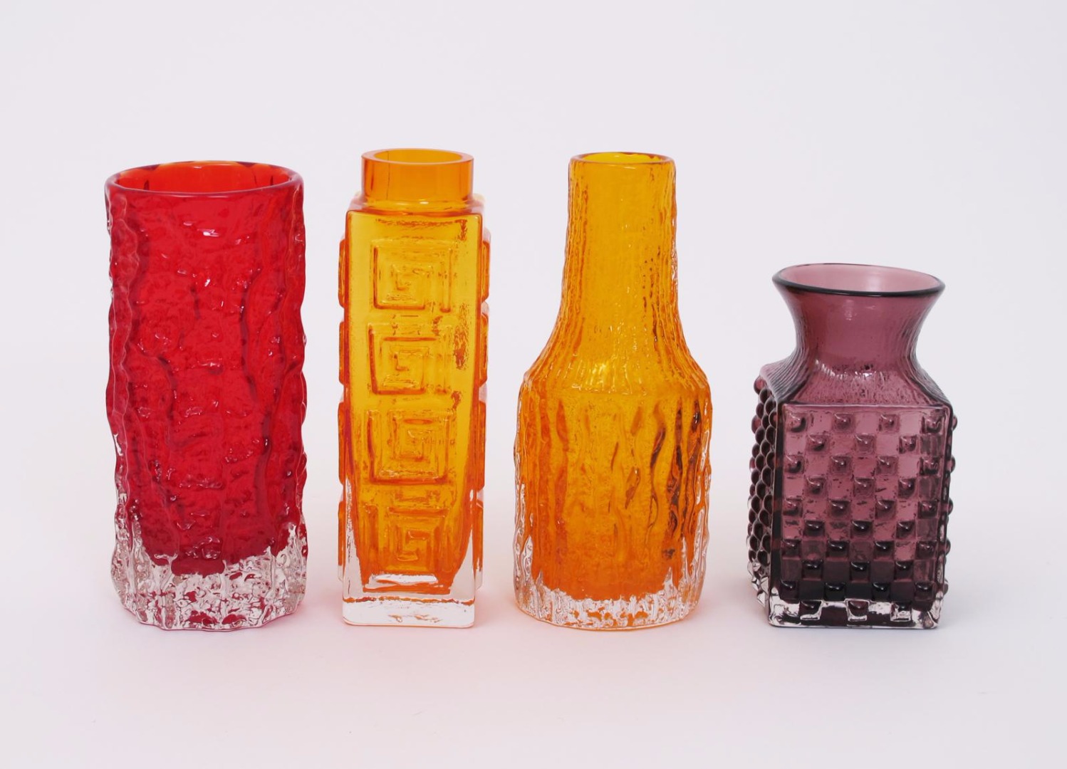 A Whitefriars Tangerine glass Greek Key vase designed by Geoffrey Baxter, a Whitefriars Tangerine Shouldered vase, a Whitefriars Aubergine Chess Board vase and a Ruby Bark vase 20cm. high (4)