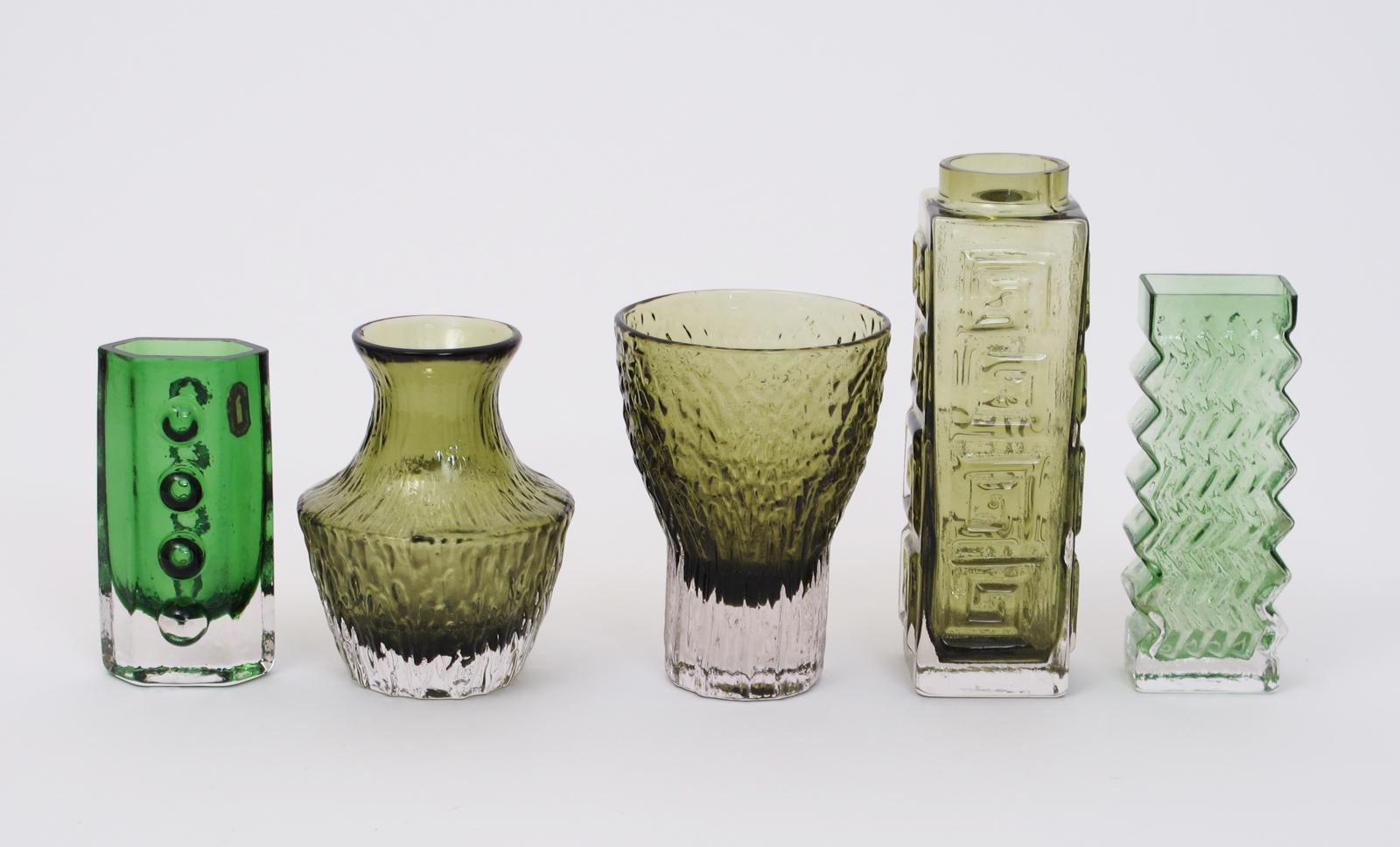 A Whitefriars Meadow Green glass Greek Key vase designed by Geoffrey Baxter, and four other Whitefriars Meadow Green vases, one with Whitefriars paper label, 20cm. high (5)