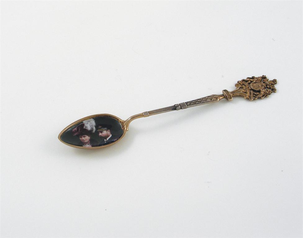 A silvergilt and enamel 'souvenir' teaspoon, with the dual portrait of King George V and Queen Mary in the bowl, with English import marks for London 1910.