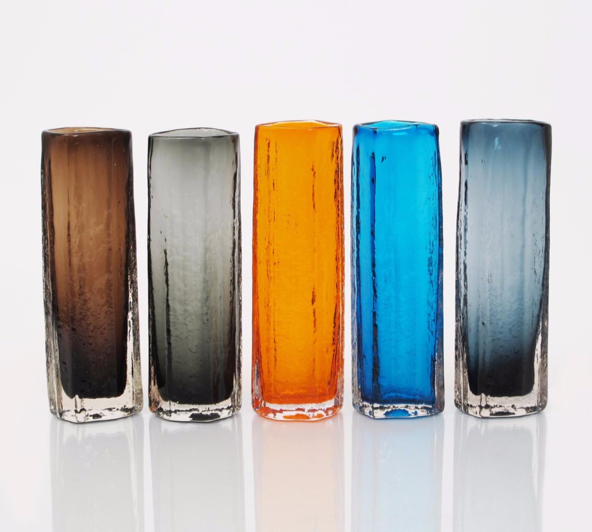 Five Whitefriars glass Cucumber vases designed by Geoffrey Baxter, comprising Tangerine, Kingfisher Blue, Cinnamon, Willow and Indigo, 29.5cm. high (5)