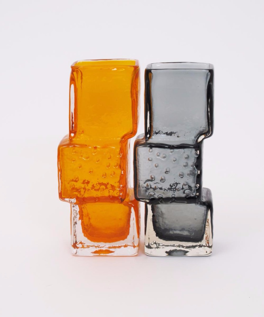 A Whitefriars Tangerine glass Drunken Bricklayer vase designed by Geoffrey Baxter, and a Whitefriars Pewter glass Drunken Bricklayer vase 21cm. high (2)