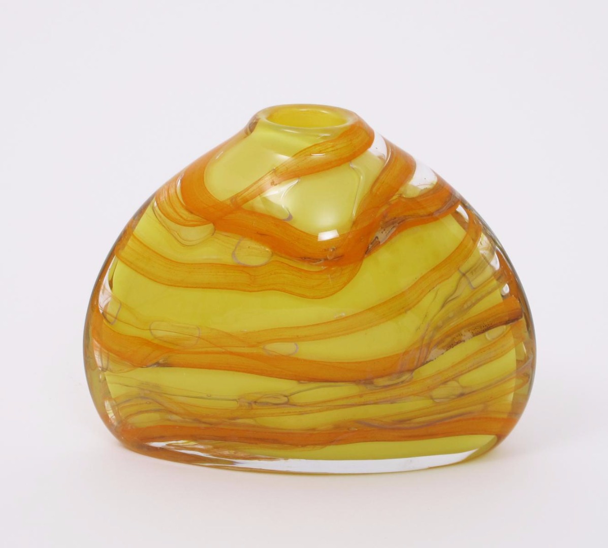 a Rosenthal Studio Line glass vase, tapering, elliptical form yellow glass with orange irregular stripes and air bubble inclusions, cased in clear etched Samuel Herman 20422, 21/200 acid etched Rosenthal Studio Line mark, 18cm. high