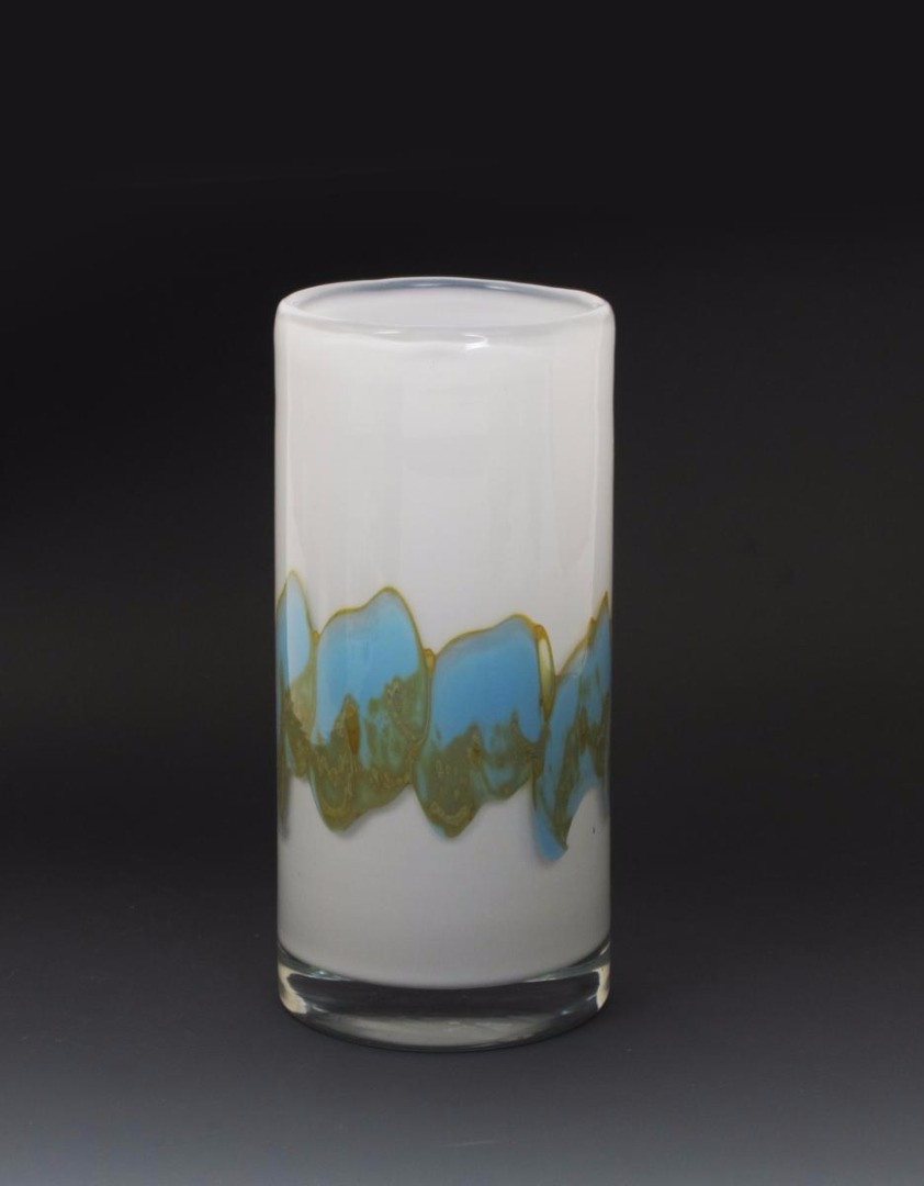 a Rosenthal Studio Line glass vase, cylindrical form opaque white glass with a frieze of blue and golden yellow, cased in clear etched Samuel J Herman signature, 20428 19/200, acid etched Rosenthal studio line mark, 27.5cm. high