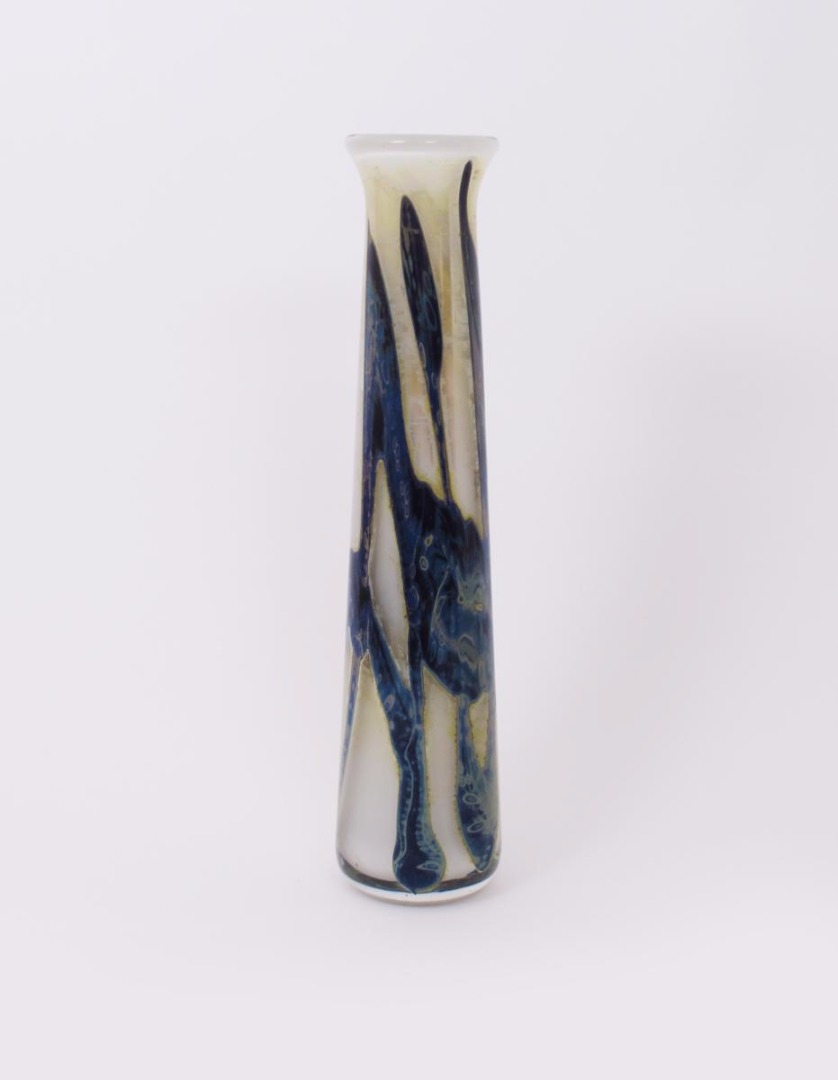 a tall Val St Lambert vase, opaque white cased in clear surface decorated with metallic blue stripes, etched Val St Lambert SH monogram to base 48.5cm. high