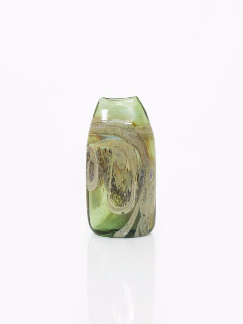 a tall shouldered vase, dated 1977, made at the Jam Factory, South Australia, pale green glass body surface decorated with metallic oxide swirls, etched SA1850 Samuel J Herman 1977 34.5cm. high
