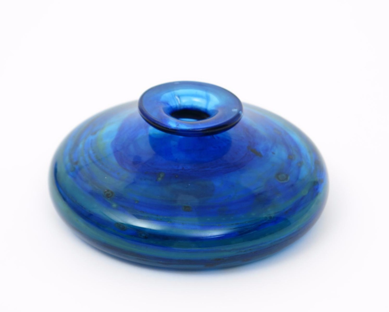 A Michael Harris Isle of Wight Glass vase, compressed form with everted rim, blue streaked glass cased in clear, etched Michael Harris Isle of Wight 15cm. diam.