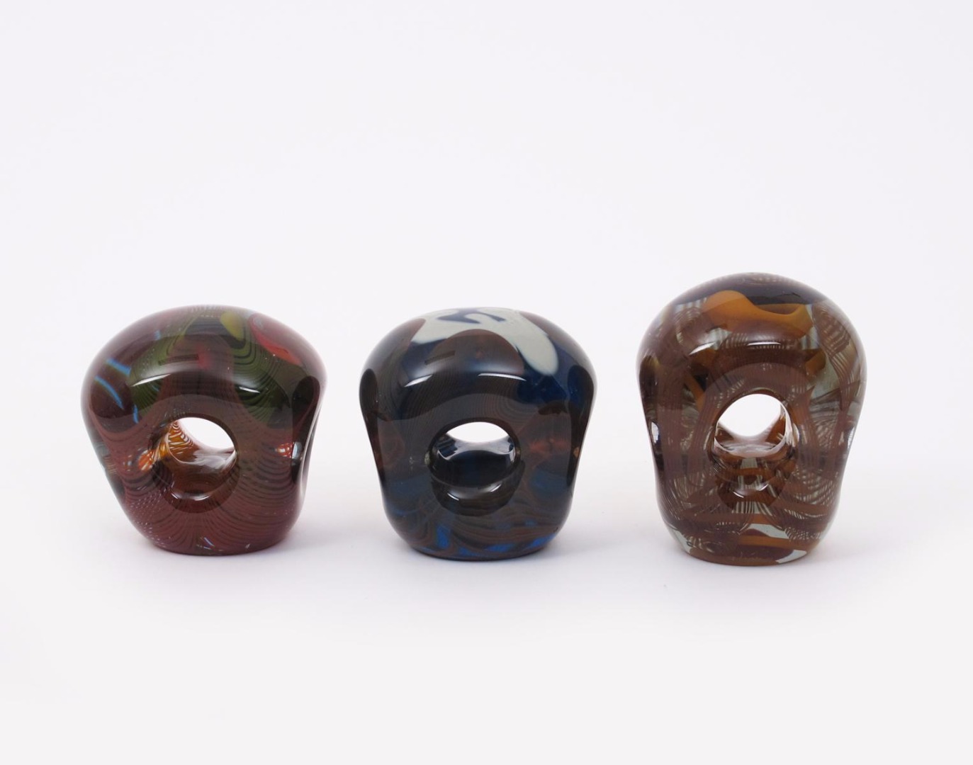 A paperweight by Karlin Rushbrooke, dated 1975, the glass body with four pierced holes forming a hollow body, with trailed yellow and red glass and white panel to top, and two other Karlin Rushbrooke paperweights etched signature and dates 9cm. high, (3)