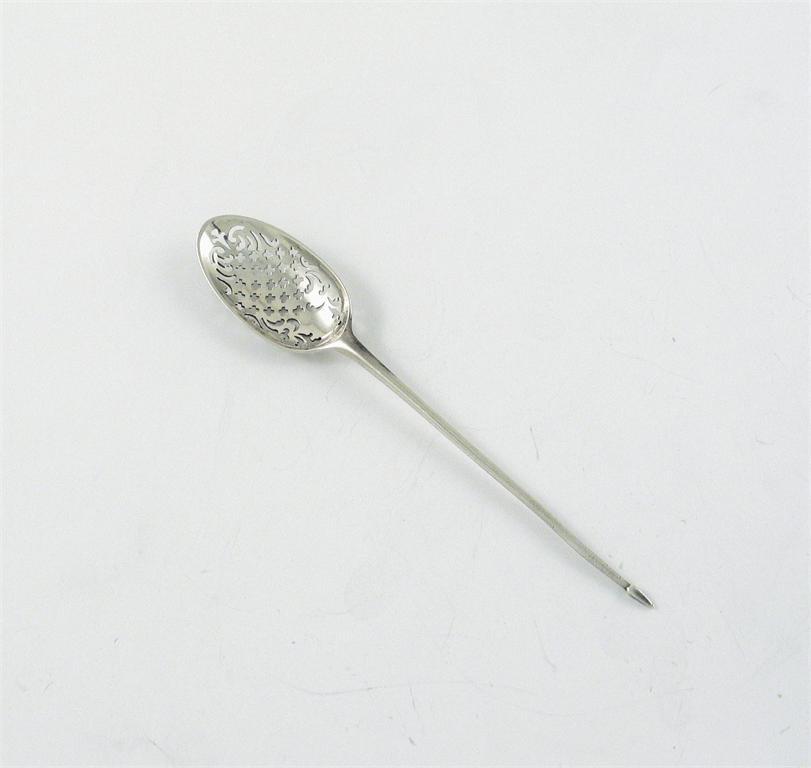 A George II/III mote spoon, initialled 'EW' on the drop, marks distorted, London c.1760, 5.5in (14cm) long.
