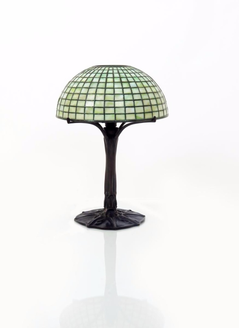 A Tiffany & Co leaded glass and patinated bronze desk lamp, designed by Louis Comfort Tiffany, model no. 461, green and opaque white leaded Brick glass with verdi gris leading, stamped marks to shade rim and base 42.5cm. high