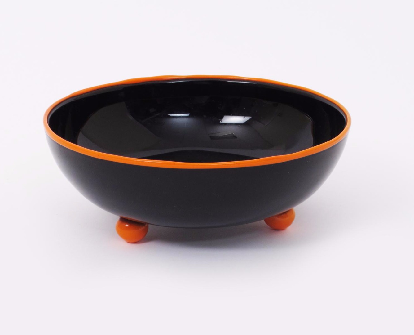 A Loetz glass footed bowl designed by Michael Powolny, the black glass body with applied orange rim and three ball feet remains of retailers paper label 21cm. diam.