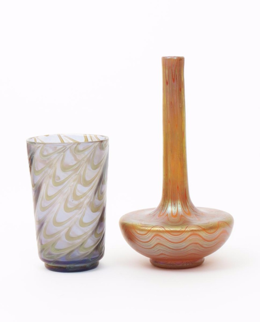 A Loetz iridescent glass solifleur vase, compressed body with tall cylindrical neck, covered in a Phanomen combed golden iridescence over orange, and another glass vase in the manner of Loetz, unsigned 25.5cm. high (2)