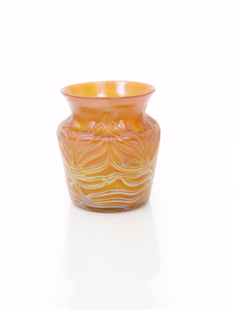 A Loetz glass vase, shouldered cylindrical form with everted rim, the orange glass body with applied trail decoration and lustrous finish etched Loetz Austria to the pontil 15.5cm. high