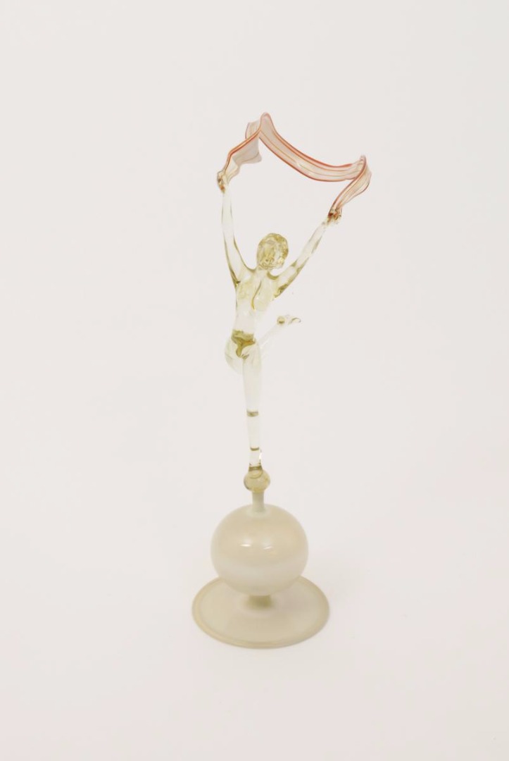 A Bimini Werkstatte glass figure of a scarf dancer, the clear glass figure modelled balancing on one foot her arms raised and holding a red and white striped scarf billowing in the wind, on opaque glass globe and flaring foot unsigned 31cm. high