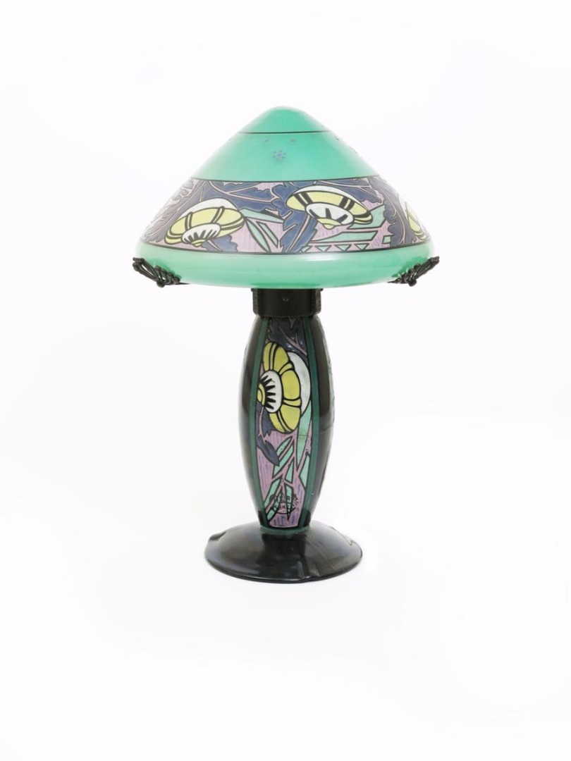 A De Latte enamelled glass table lamp and shade, enamelled in colours with panels fo stylised flowers and foliage signed A De Latte France to base, repaired 53cm. high