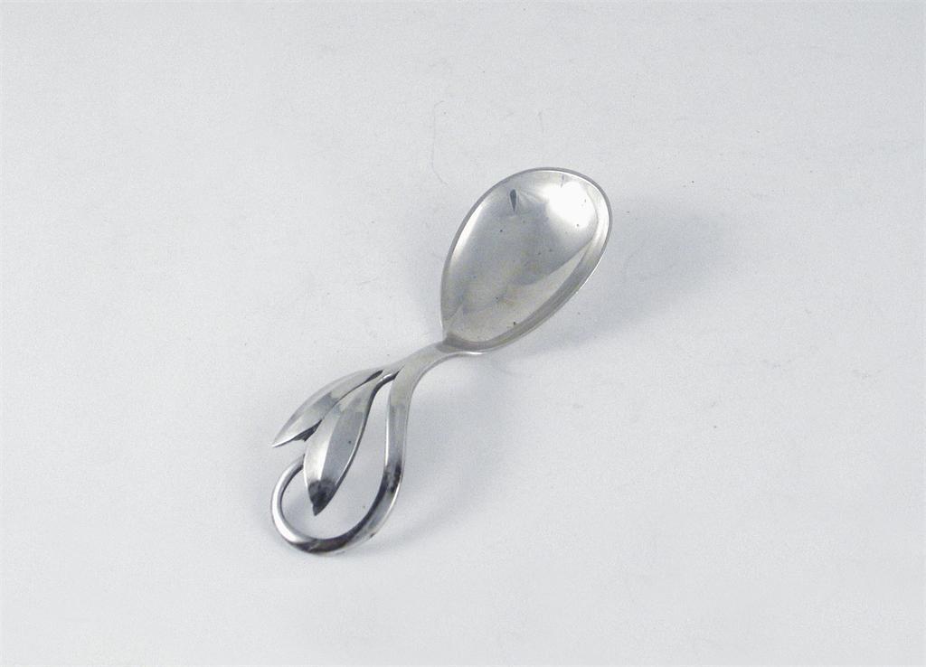 A modern Danish caddy spoon, with a leafy tendril stem, Copenhagen 1935.