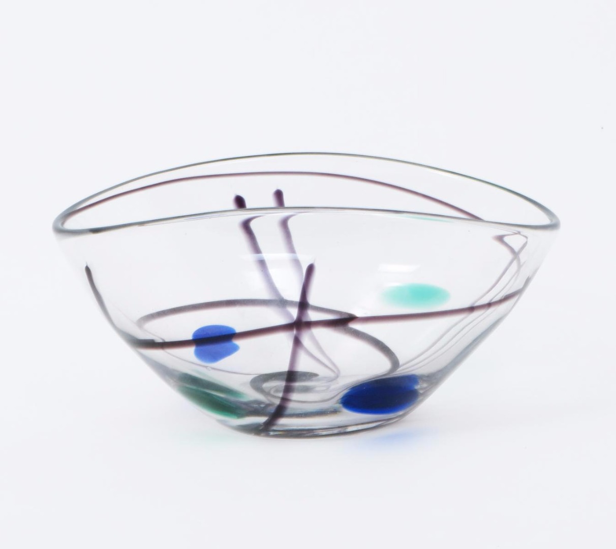 A Kosta Boda glass bowl, elliptical form, blue and turquoise spots with aubergine swirling lines, cased in clear etched Kosta mark 22cm. wide.